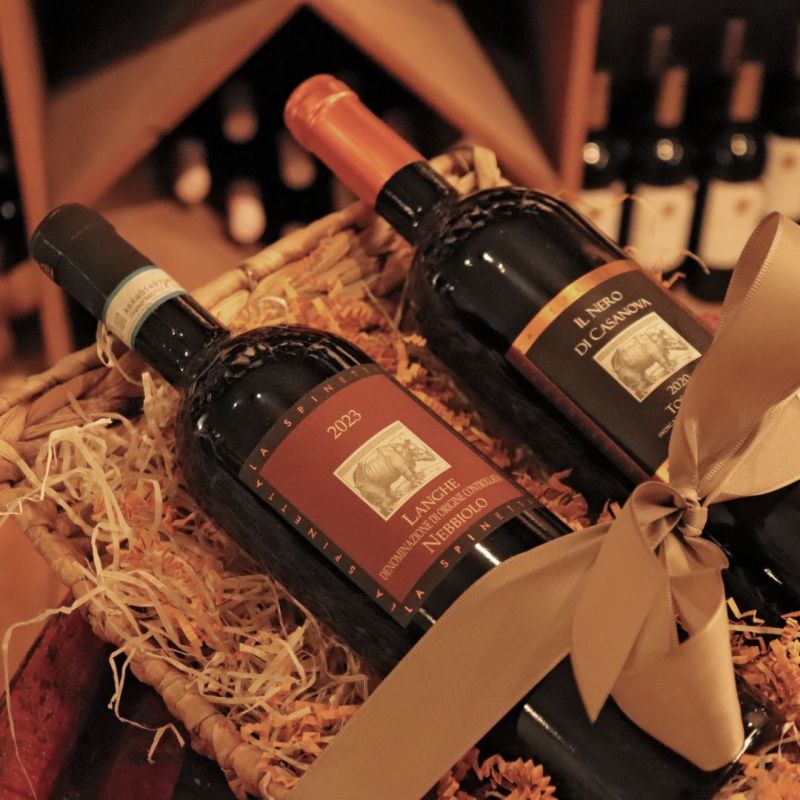 2 Flaschen ausgezeichnete Rotweine - Nebbiolo, Piemont und Sangiovese, Toskana im Präsentkorb.